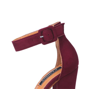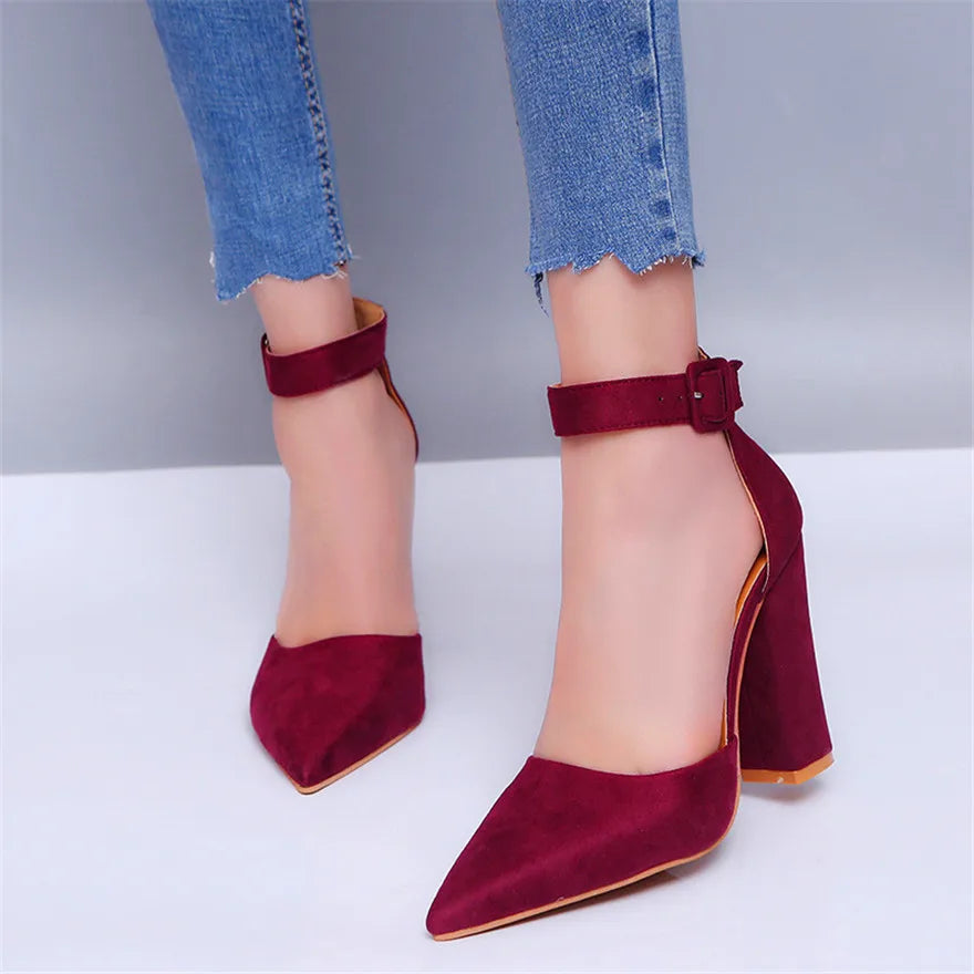 Ankle Belt Buckle Sexy Women Sandals Thick Heel Summer Shoes Pink Black Flock Pointed Toe Female High Heels Party Wedding Pumps