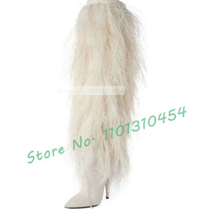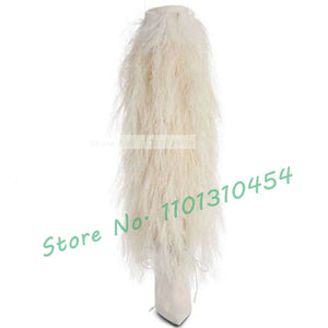 Black Fur Knee-length Boots Women Sexy Pointy Toe High Heels Furry Suede Shoes Outfit Ladies Trendy Party Warmly Winter Shoes