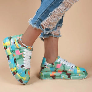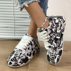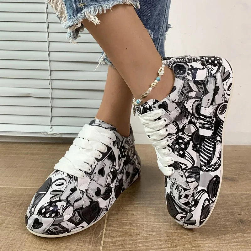 Women's Casual Sneakers 2023 Fashion New Painted Graffiti Lace Up Sports Shoes for Women Flat Pu Leather Ladies Running Shoes