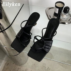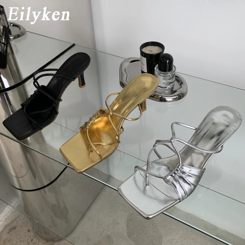 Eilyken Gold Narrow Band Women Slipper Female Square Pinch Toe Low Heel Slides Sandal Flip Flops Mujer Shoes