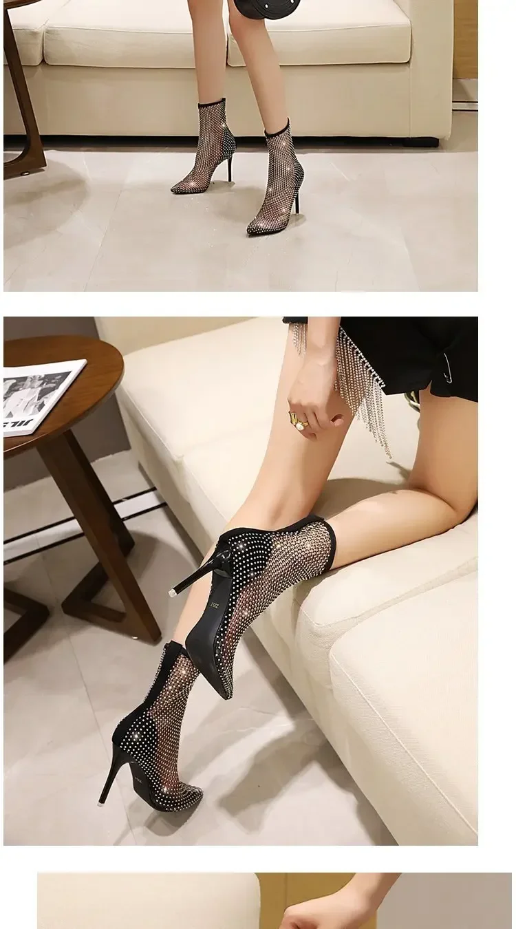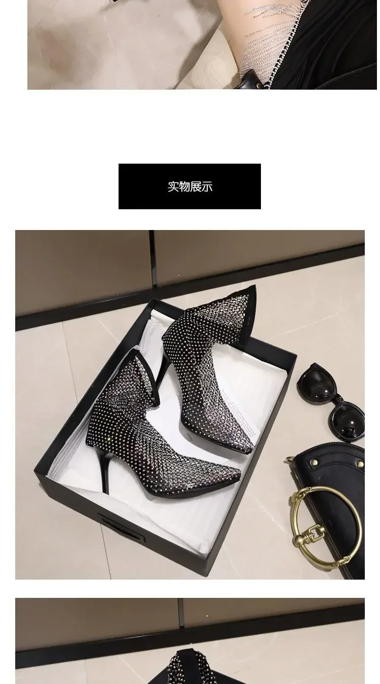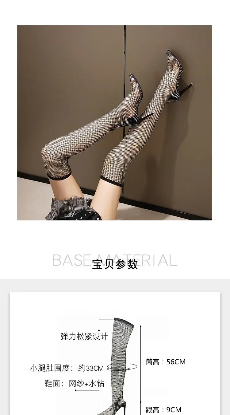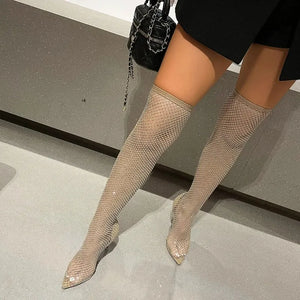 Summer Knee High Sandal Boots Luxury Women Sexy Rhinestone Pointed Toe Thin Heels Thigh Mesh Sock Shoes Botas De Mujer