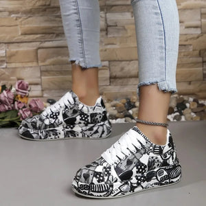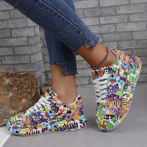 Women's Casual Sneakers 2024 Fashion New Painted Graffiti Lace Up Sports Shoes for Women Flat Pu Leather Ladies Running Shoes