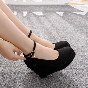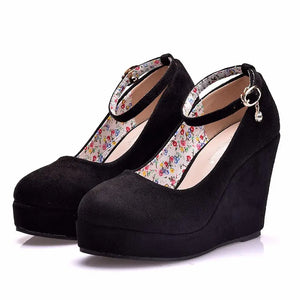 Crystal Queen High Heels Platform Wedge Female Pumps Women's Flock Buckle Bowtie Ankle Strap Wedding Shoes Round Toe White