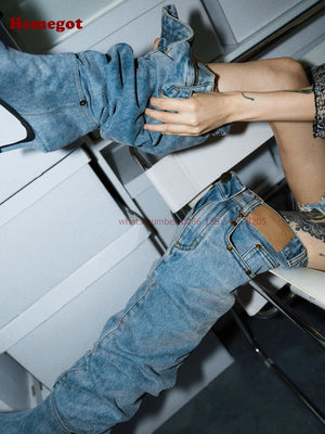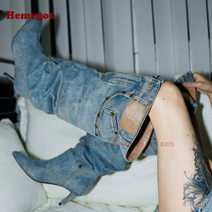 Denim Pants Boots Pointy Toe Pleated Over The Knee Boots for Women Winter 2024 Casual Rivet Pocket Decor Patchwork Luxury Shoes