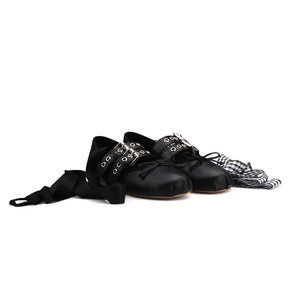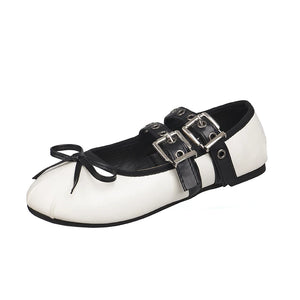French ballerina ballet flats women's soft leather bow lace-up shallow Metallic belt trim car stitching cross straps belt buckle
