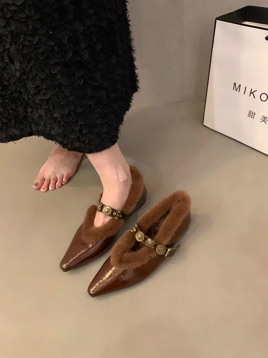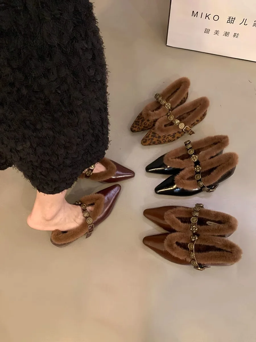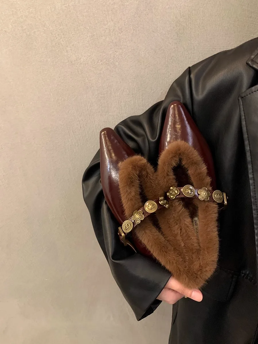 Fur Pointed Toe Women Sexy Chelsea Boots Elegant Ankle Flats Warm Winter Shoes 2024 New Designer Style Fashion Female Footwear