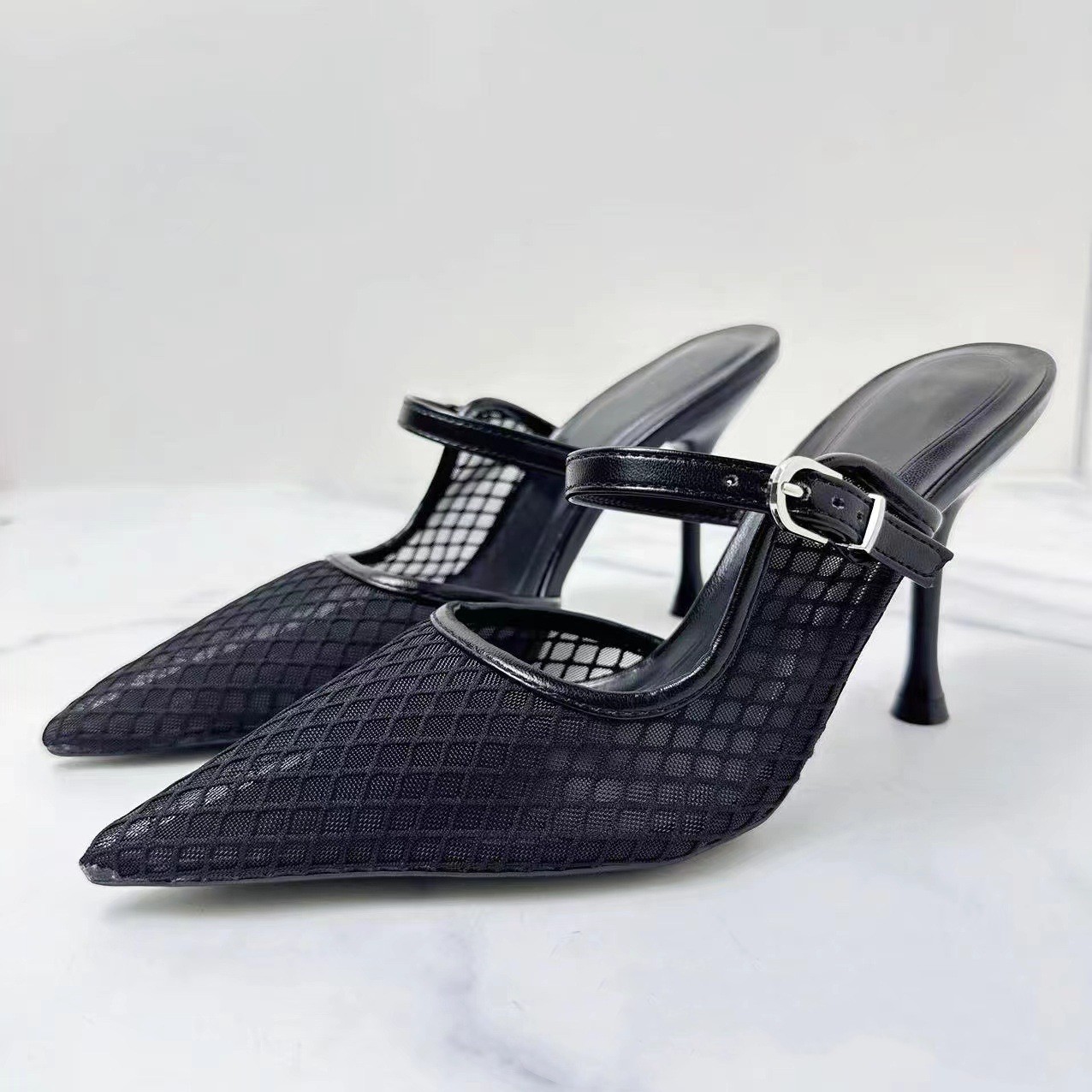 High Heels Mules Shoes for Laides Sexy Pointed Toe 2025 Summer Stilettos Black Hollow Breathable Mesh Vintage Women's Sandals