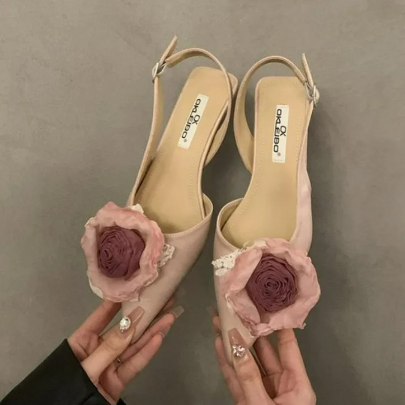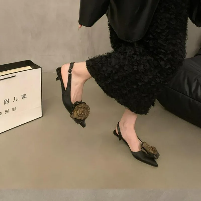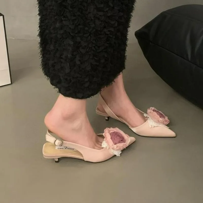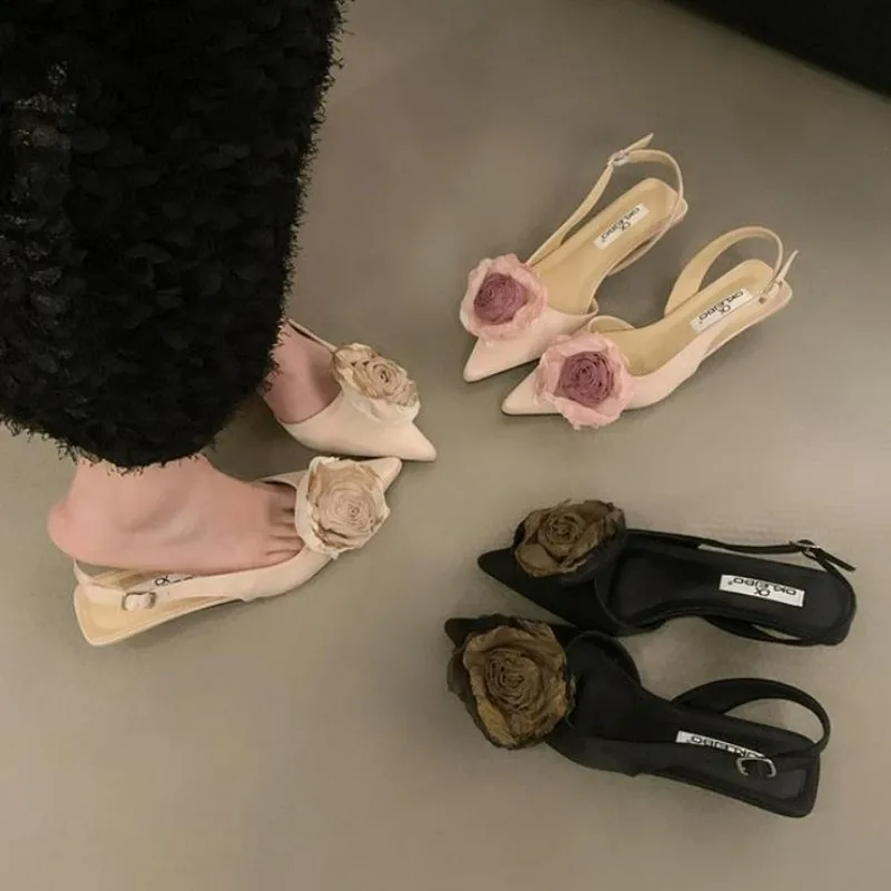 New Flower Designer Sandals Women Elegant Satin Mule Shoes Summer Pointed Toe Pumps Low Heel Flowers Slingback Sandals Female