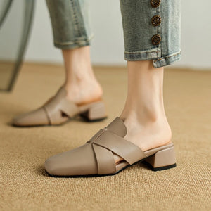 NEW Summer Women Mules Genuine Leather Shoes for Women Cover Toe Chunky Heel Slippers Concise Square Toe Handmade Modern Sandals