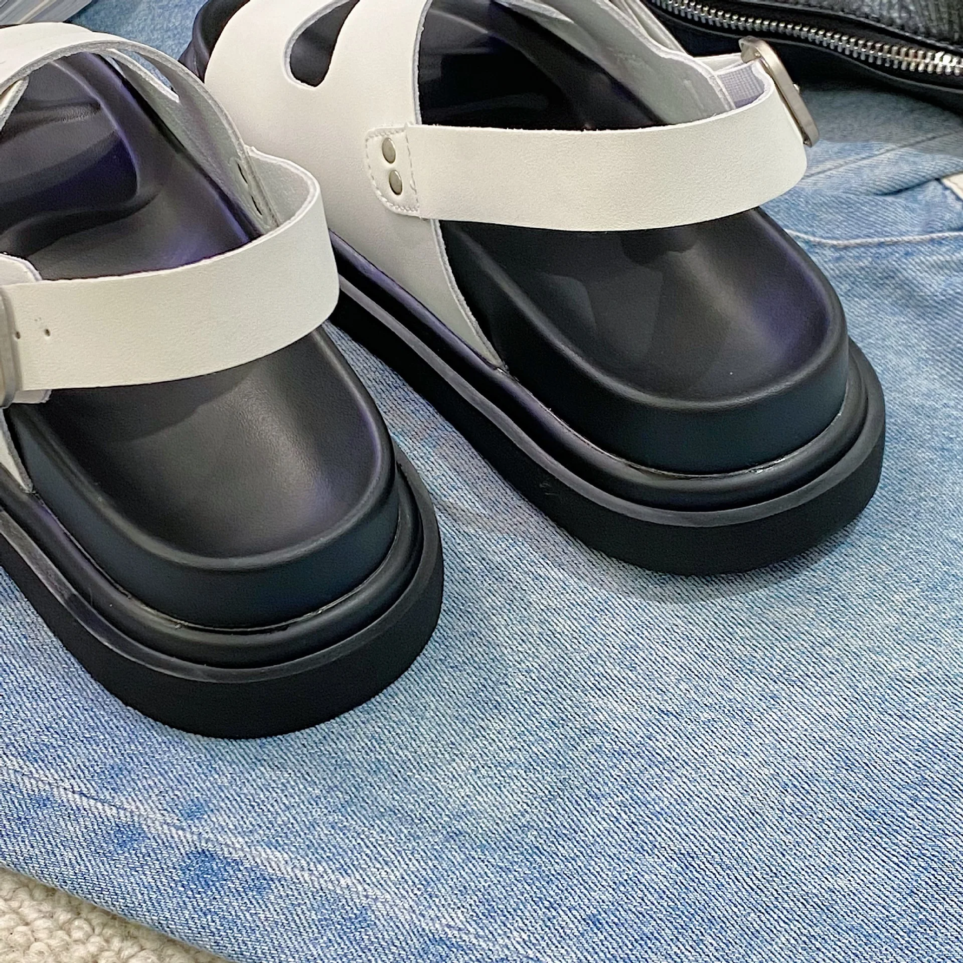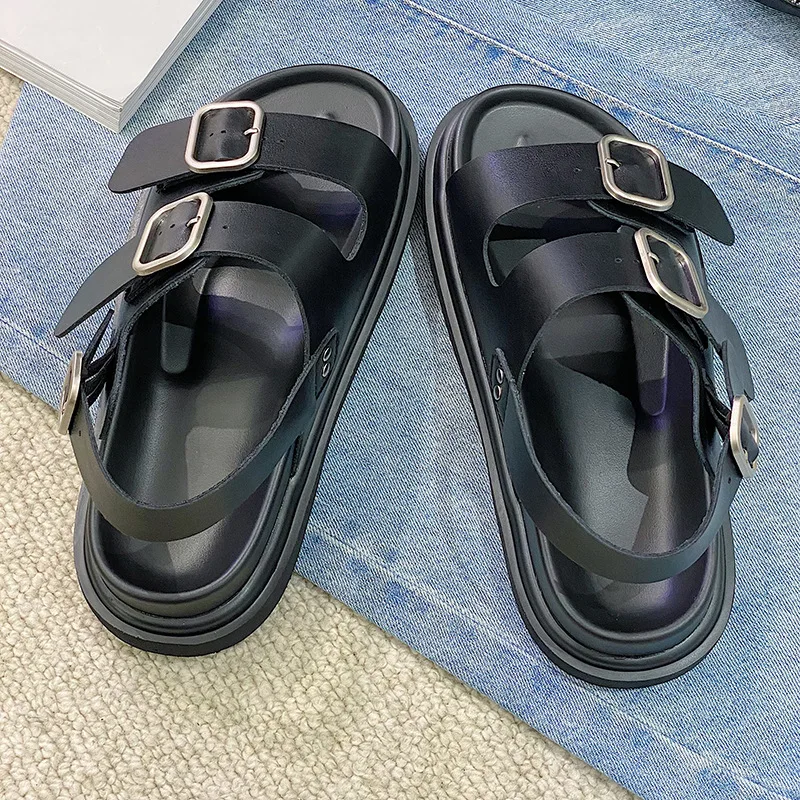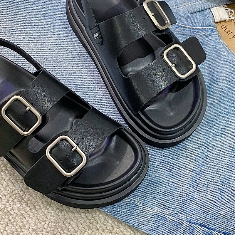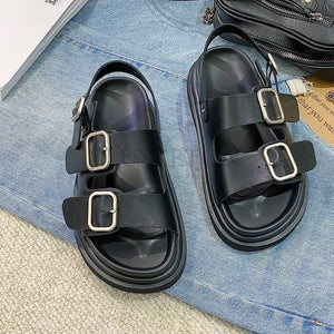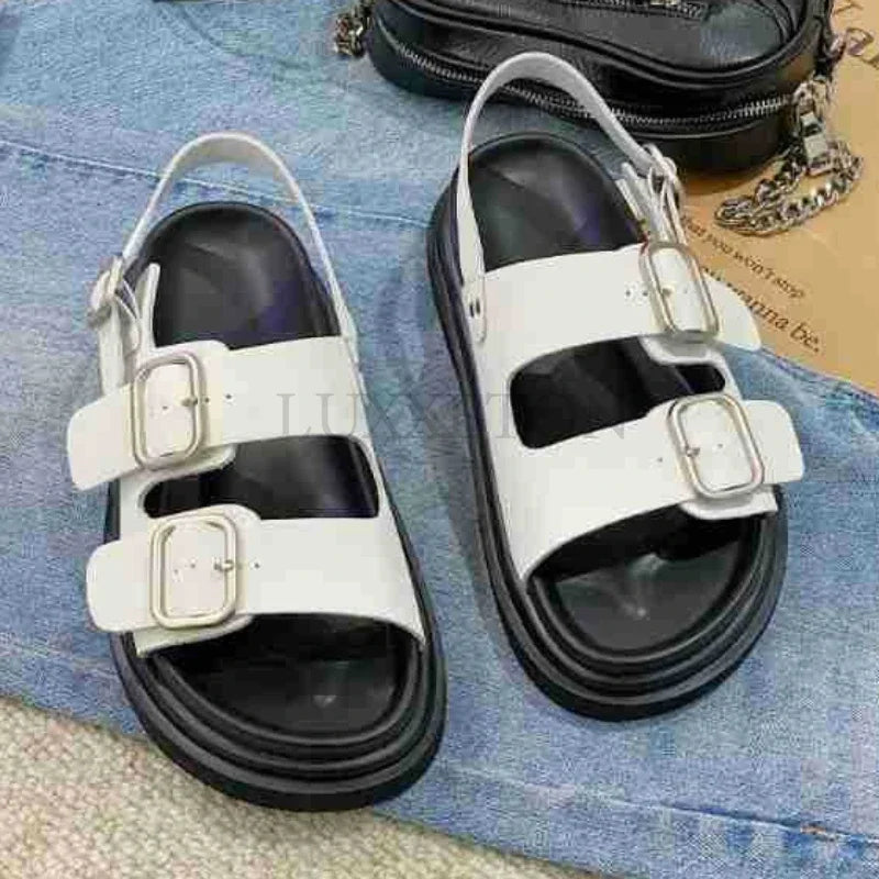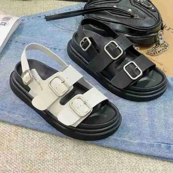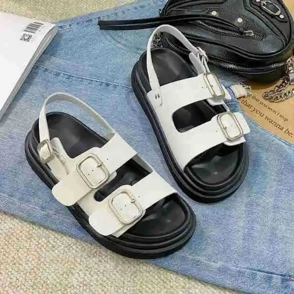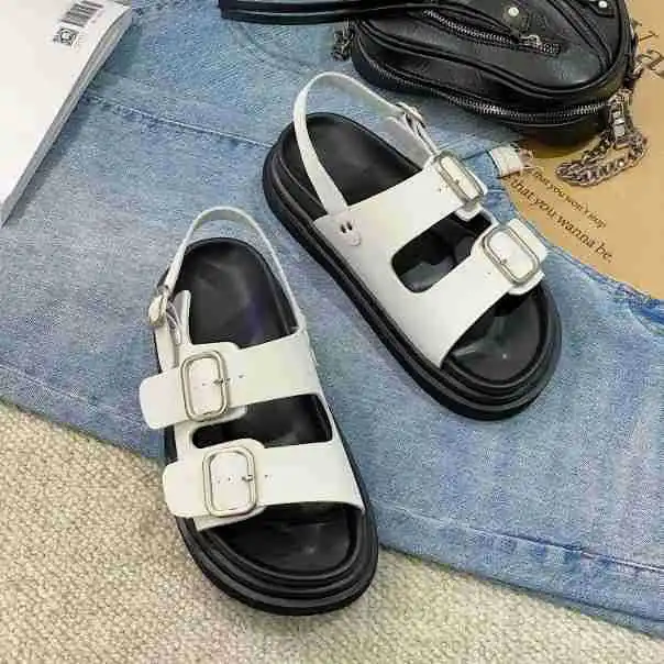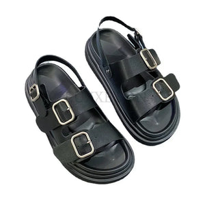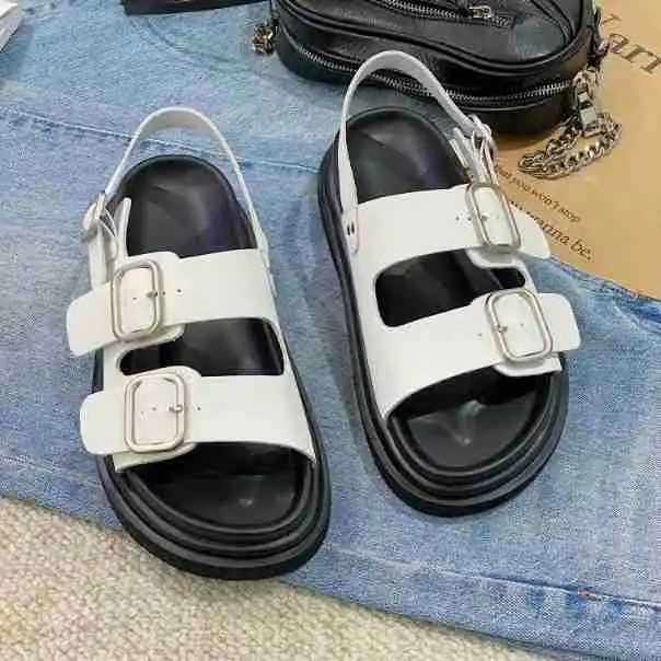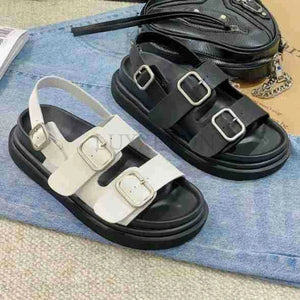 Sandals Women Genuine Cow Leather Metal Detailed Ankle Buckle Strap Summer Beach Ladies Low Heel Shoes Handmade