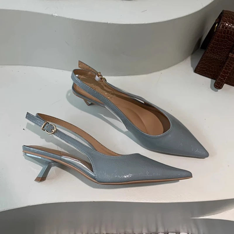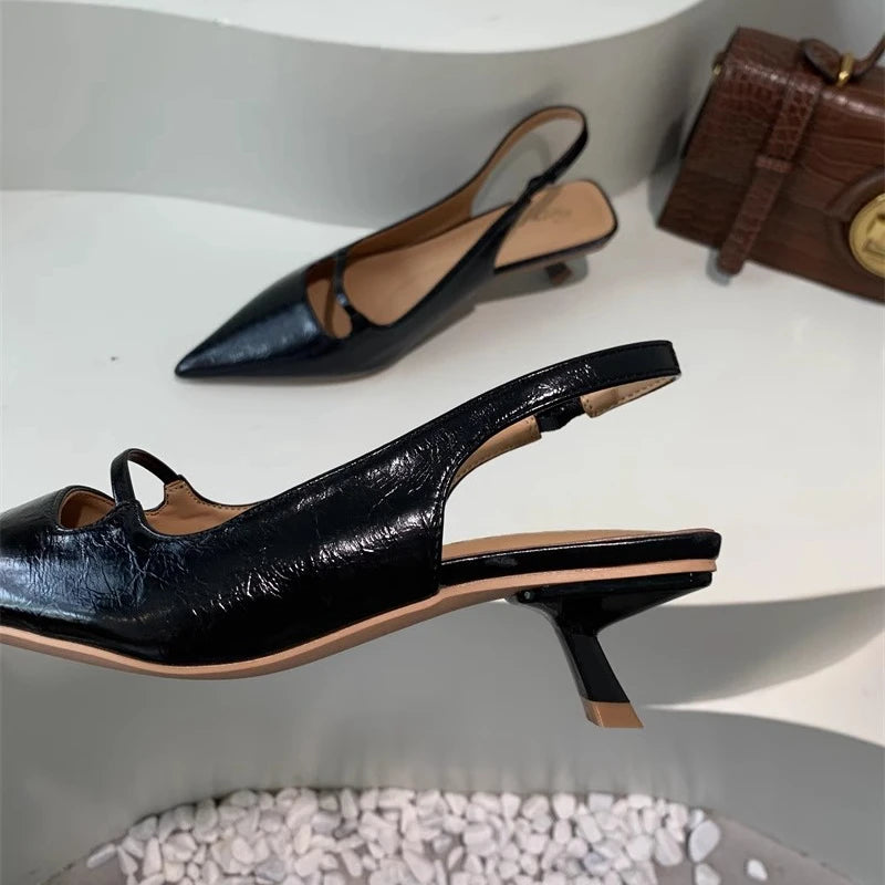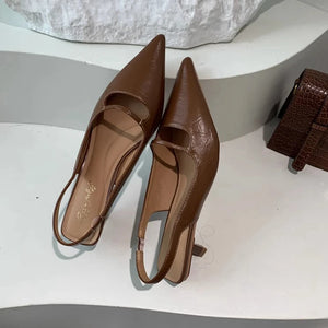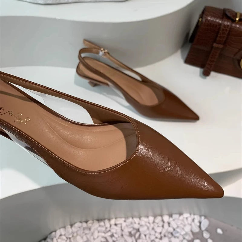 SUOJIALUN Summer New Women Sandal Fashion Pointed Toe Shallow Slip On Ladies Elegant Slingback Shoes Thin Med Heel Dress Mules