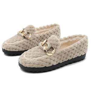 Winter Thicken Soled Wool Shoes Woman Plush Fur Flats Cotton Loafers Ladies Brand Crystal Chain Moccasin Femme Lambswool Sneaker